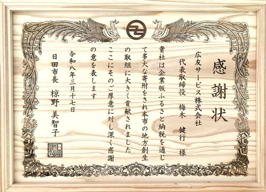 日田市より感謝状を拝受いたしました(企業版ふるさと納税)